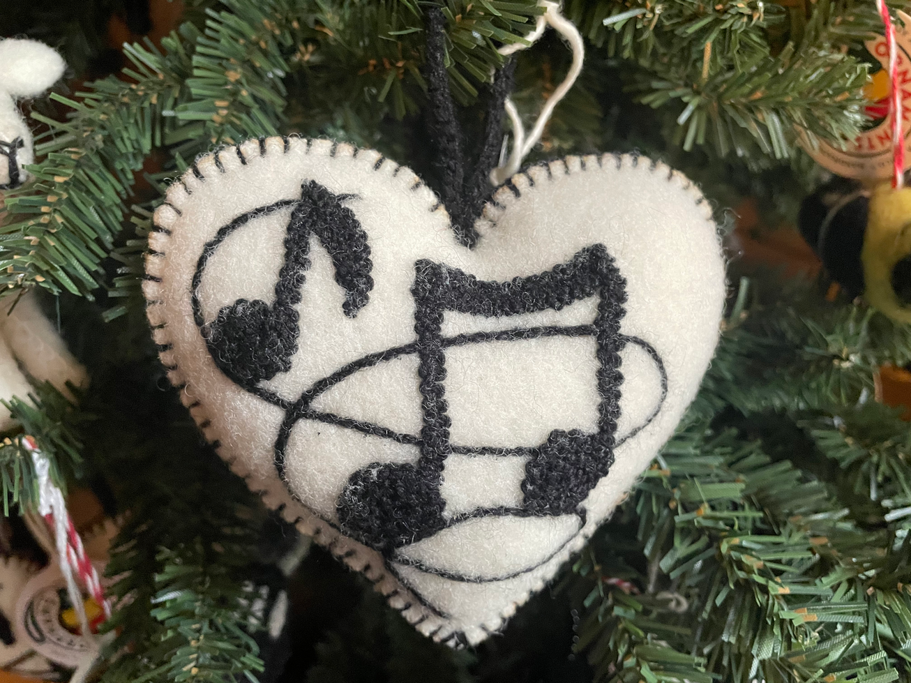 Our embroidered Music Note Ornament will put a song in your heart. This classic wool heart is handmade by artisans in Peru, South American using traditional craftsmanship. Each plush heart is hands ticked with a black edge and musical notes.